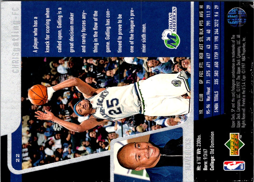 From the 1996 SP Chris Gatling collection comes this #22 Dallas Mavericks card. Gatling was an NBA All-Star in 1996, and his performance for the Mavericks that season was impressive. He averaged 18.3 points and 8.2 rebounds per game, helping the Mavericks to a 50-32 record and a spot in the playoffs. This card features Gatling in his distinctive Mavericks uniform in high-resolution photography, and is a great addition to any basketball fan's collection.