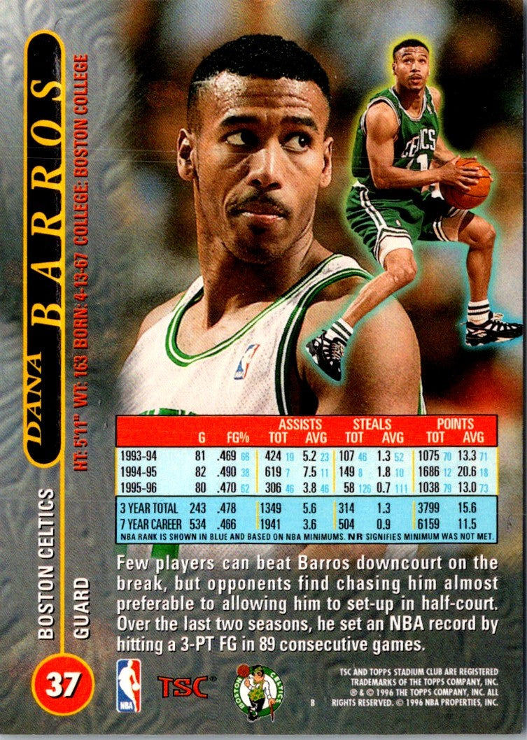 This 1996 Stadium Club Dana Barros #37 Boston Celtics card is a must-have for any Celtics fan. Featuring the sharpest photography and highest quality printing, card collectors will appreciate the detail and craftsmanship of this card. It features the classic Celtics uniform and Barros' signature on-court style. This card is sure to become a treasured part of any collection. Add this card to your collection today and be part of Celtics history!