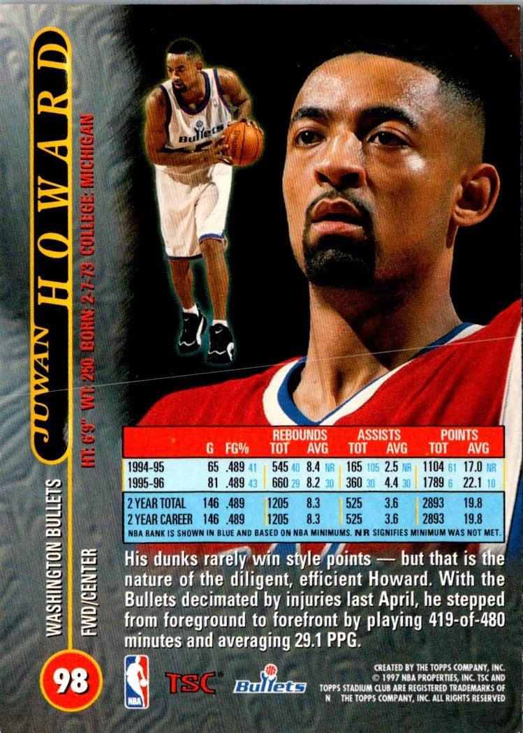This vibrant 1996 Stadium Club Juwan Howard #98 Washington Bullets card is a must-have for any basketball fan's collection. Featuring a classic portrait of Juwan Howard and vibrant colors that pop, this card is sure to stand out in any display. With a limited print run, this card is sure to become a timeless piece of basketball history. Get your hands on this card before it's too late!