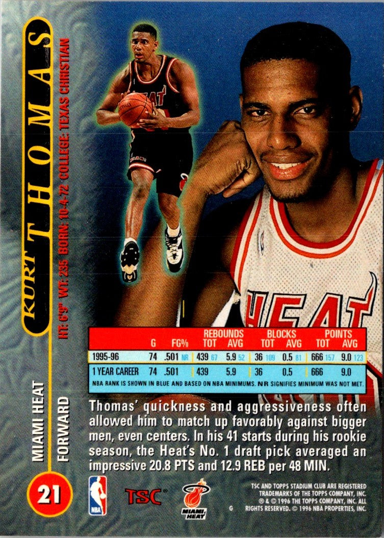 This 1996 Stadium Club Matrix Kurt Thomas #21 Miami Heat card is a must-have for any basketball card collector. Featuring the Florida native in full Miami Heat uniform, this card is sure to be a conversation piece in any collection. The card is printed on high-quality card stock with bright colors and crisp details, sure to stand out against any other cards. With a classic design and a popular player, this card is sure to be a hit with any fan. Add this card to your collection today and add a piece of Miami Heat history to your collection.