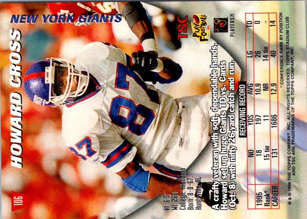 This 1996 Stadium Club Members Only Howard Cross card is a must-have for any New York Giants fan! Featuring a glossy finish and vibrant colors, this card is sure to stand out in any collection. As a Members Only card, it includes exclusive perks and benefits, making it an even more valuable addition to your memorabilia. Add a piece of NFL history to your collection today!