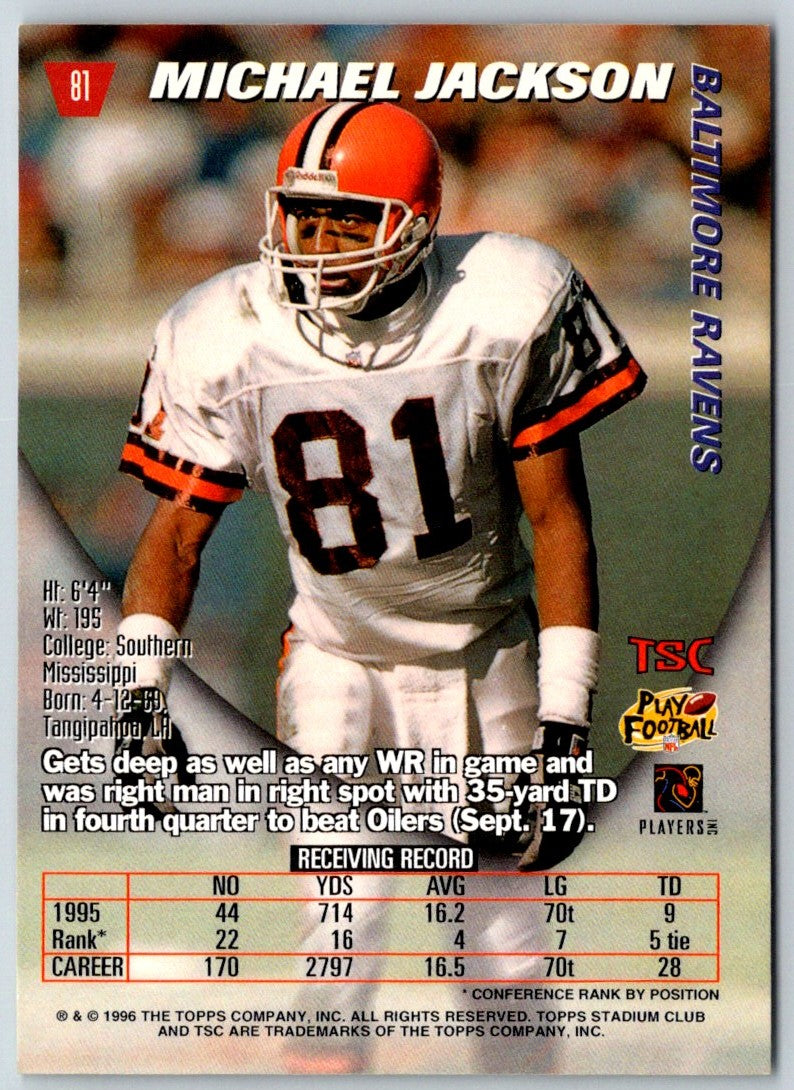 This 1996 Stadium Club Members Only Michael Jackson #81 Baltimore Ravens card is the perfect addition to any sports fan's collection. Featuring vibrant colors and an iconic image of the legendary artist, this card is sure to be a hit with any collector. Featuring sharp corners and a glossy finish, this card is in great condition, perfect for display. This card is sure to make a great conversation piece and an amazing addition to any Ravens fan's collection. Grab this card before it's gone!