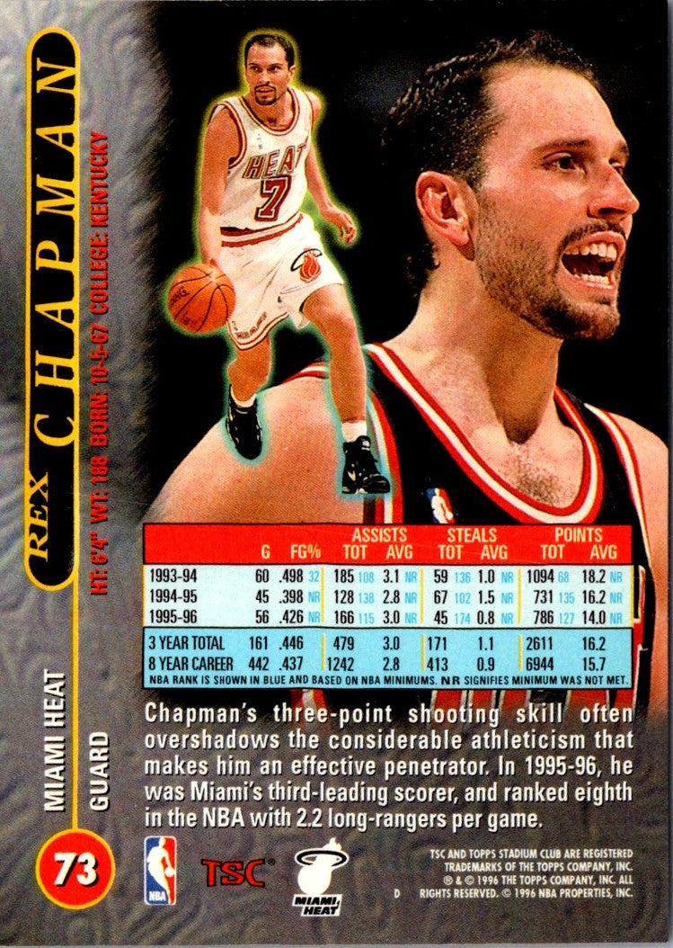 This 1996 Stadium Club Rex Chapman #73 Miami Heat card is a must-have for any basketball fan. Featuring the former Kentucky Wildcat and NBA All-Star, the card is a great addition to any collection. Featuring a sharp, glossy finish and a vibrant full-color image of Chapman in his Miami Heat uniform, this card will add a professional look to any fan's collection. With the card's high-quality construction, it is sure to last for years to come. Whether you're just starting a collection or adding to an existing one, the Stadium Club Rex Chapman #73 Miami Heat card is the perfect choice.