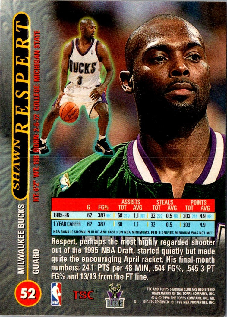 This 1996 Stadium Club Shawn Respert #52 Milwaukee Bucks card is perfect for any Bucks fan or sports collector. Respert was an All-American at Michigan State and was drafted with the 8th overall pick in the 1995 NBA draft. He played two seasons for the Bucks and was an NBA All-Rookie selection in his first season. The card features a crisp, clear image of Respert in his classic Bucks uniform and is sure to be a great addition to any collection.