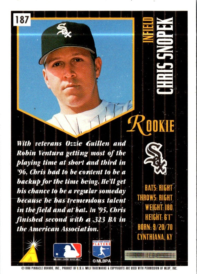 This 1996 Summit Chris Snopek #187 Chicago White Sox card is a must-have for any collector of baseball memorabilia. It features a full-color image of the player in his uniform, with great detail and clarity. The card is printed on a glossy stock with the team logo and a player biography on the back. This card is sure to be a great addition to any collection.