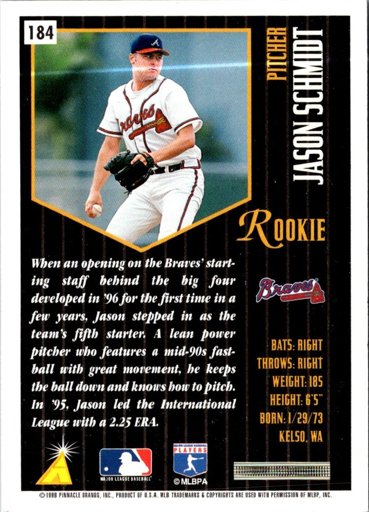 This 1996 Summit Jason Schmidt #184Atlanta Braves card is a great addition to any baseball card collection. Featuring the Braves' legendary pitcher, this card showcases Schmidt in full Braves uniform, ready to take the mound. The card is printed on a glossy stock with bright colors that really make the image pop. With its unique design and detailed image, this card is a must-have for any Braves or Schmidt fan. Add it to your collection today and commemorate a great pitcher and a great team.