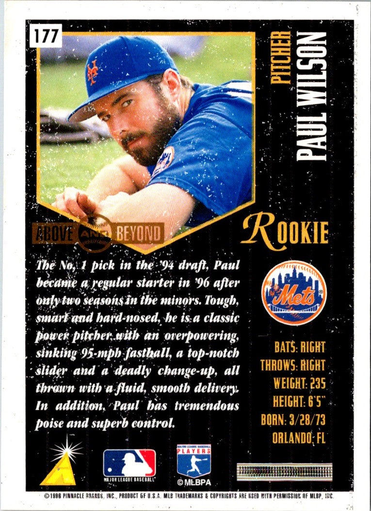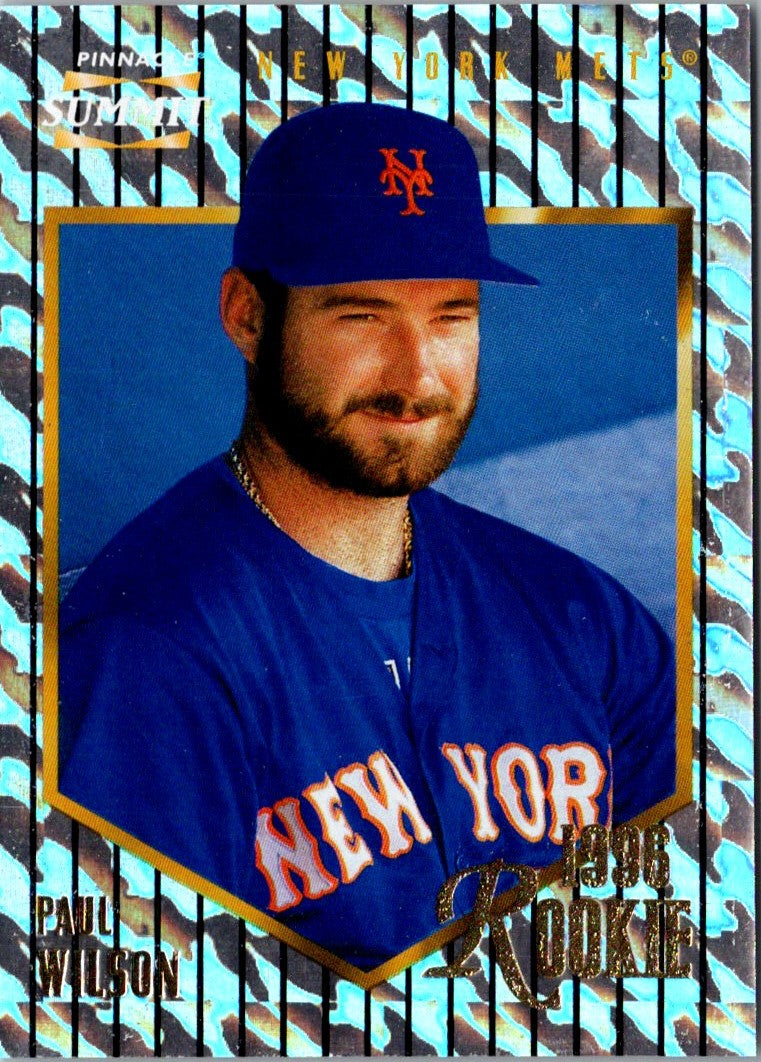 This 1996 Summit Paul Wilson #177 New York Mets card is a must-have for any Mets fan. Featuring a full-color image of the pitcher in his Mets uniform, this card is sure to stand out in any collection. The card is in excellent condition, with no creasing or damage. It's a great way to commemorate the career of this legendary pitcher. Add this card to your collection and relive the glory days of the Mets. Get your hands on this one before it's gone!