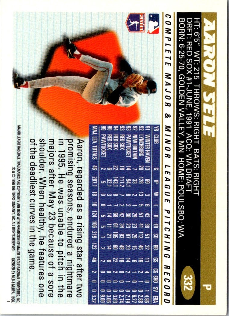 This 1996 Topps Aaron Sele #332 Boston Red Sox Card is an essential item for any serious baseball card collector. Featuring an action shot of Sele in his Red Sox uniform, this card is a great way to commemorate the pitcher's successful career. With a glossy finish, this card is sure to stand out in any collection. Get your hands on this card and add a valuable piece of baseball history to your collection.