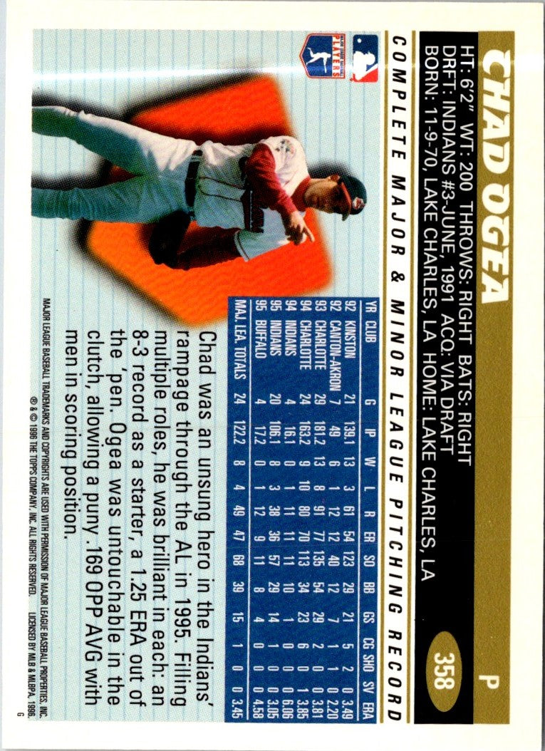 This 1996 Topps Chad Ogea #358 Cleveland Indians card commemorates the remarkable career of this pitcher. It features a great action shot of Ogea in his Indians uniform with vibrant colors that really pop. On the back of the card are his career stats, information about his personal life, and a brief description of his professional highlights. A must-have for any Cleveland Indians fan, this card is sure to be a great addition to any collection.