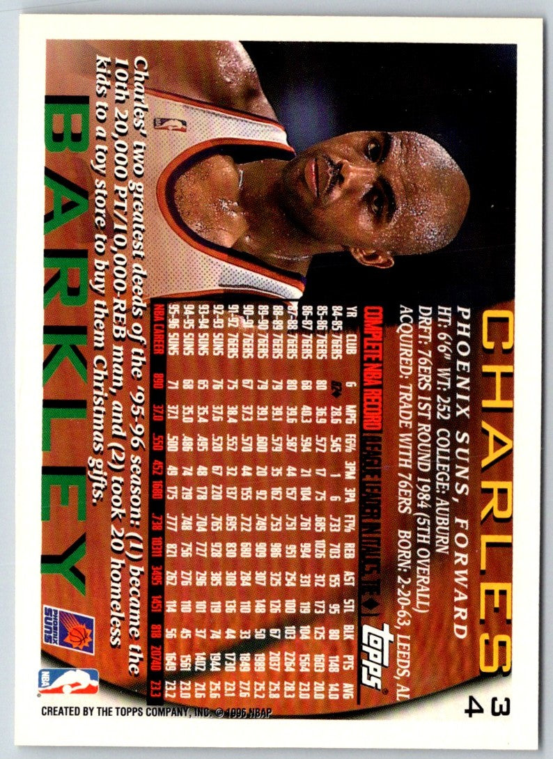This 1996 Topps Charles Barkley #34 Phoenix Suns card celebrates the Hall-of-Fame career of one of the most dominant players in NBA history. The card boasts an action shot of Barkley in his Suns uniform, looking powerful and determined. This card is the perfect way to commemorate Barkley's career and show off your knowledge of basketball history. Get your hands on this piece of NBA memorabilia today and add it to your collection!