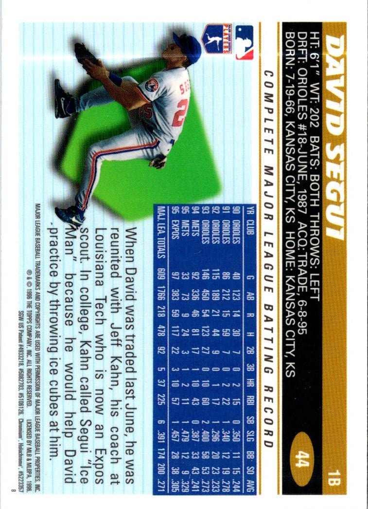 This 1996 Topps Chrome David Segui #44 Montreal Expos card is a must-have for any Expos fan! Featuring a glossy chrome finish, this card captures Segui in his Expos uniform ready to hit a home run. With stunning details and vibrant colors, this card will make a great addition to any collection. Get your hands on this classic collectible today!