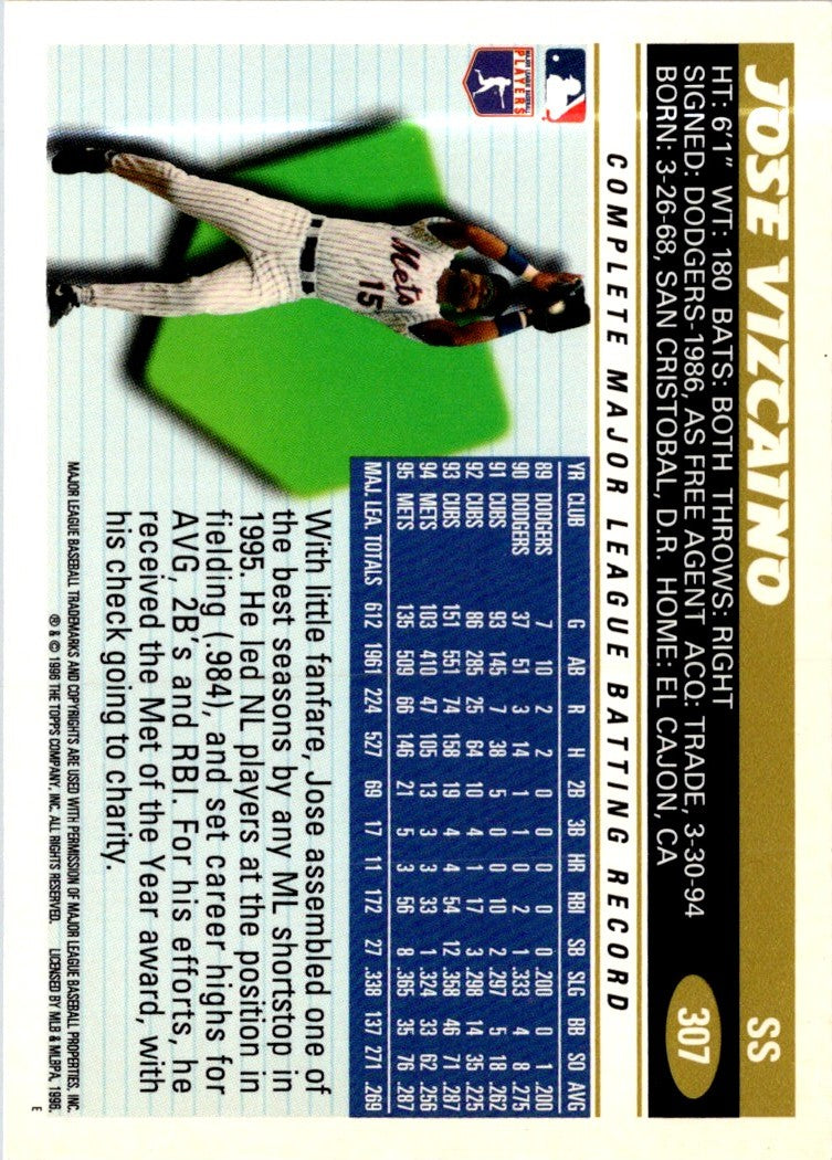 This 1996 Topps Jose Vizcaino #307 New York Mets card is a must-have for every Mets fan! Vizcaino was an integral part of the Mets' 1996 season, hitting .261 with 14 HR and 64 RBI while playing both second base and shortstop. Own a piece of Mets history with this card, which features a full-color action shot of Vizcaino on the field in his Mets uniform. The back of the card includes a detailed biography and stats of Vizcaino's career. Add this card to your collection today and relive the glory days of the 1996 Mets!
