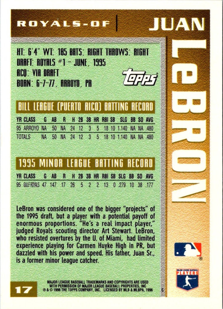 This 1996 Topps Juan LeBron card #17 from the Kansas City Royals is a must-have for any Royals fans! This card features an action shot of Juan LeBron in full Royals uniform and a detailed biography on the back. This card also features a full-color, glossy finish for a vibrant, colorful look. Add this card to your collection and commemorate the Royals' journey to the MLB!