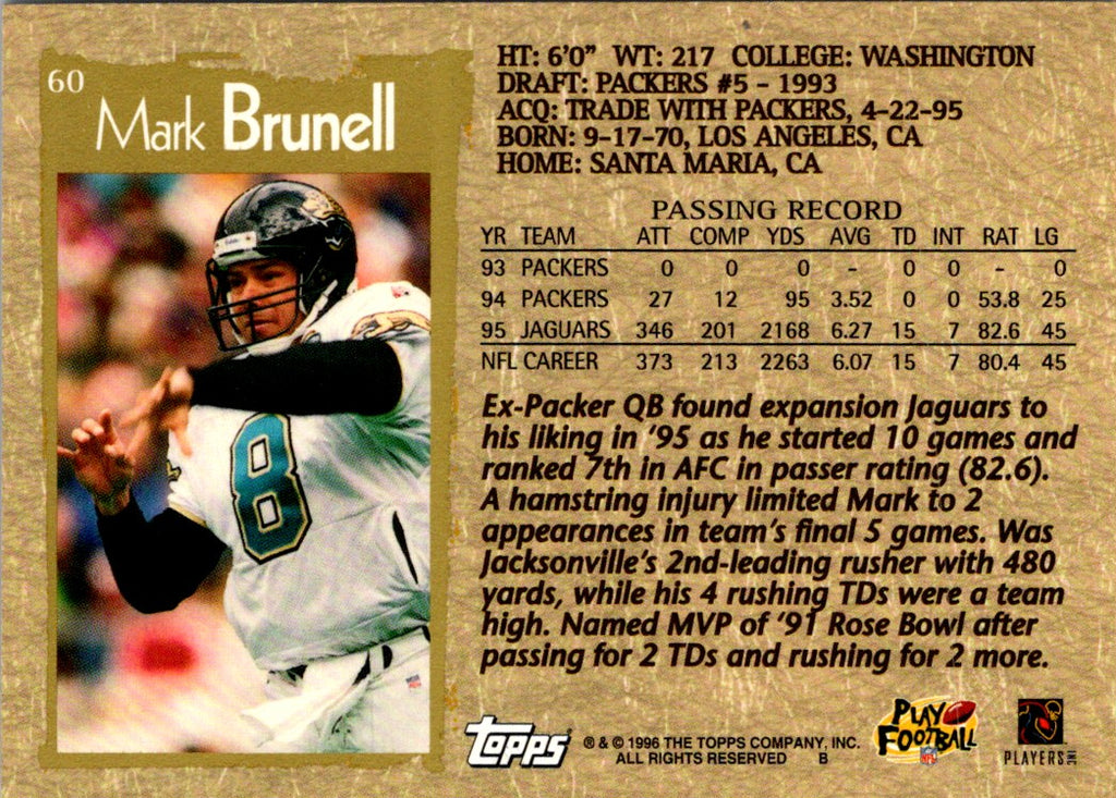 This 1996 Topps Mark Brunell #60 Jacksonville Jaguars card is a must-have for any football card collection. This card features a full-color action image of Brunell in his Jaguars uniform, complete with team logo and helmet. The card also includes an informative profile of Brunell and his career stats. This card is a great way to commemorate the legendary quarterback's career with the Jaguars and is sure to be a valuable addition to any football card collection.