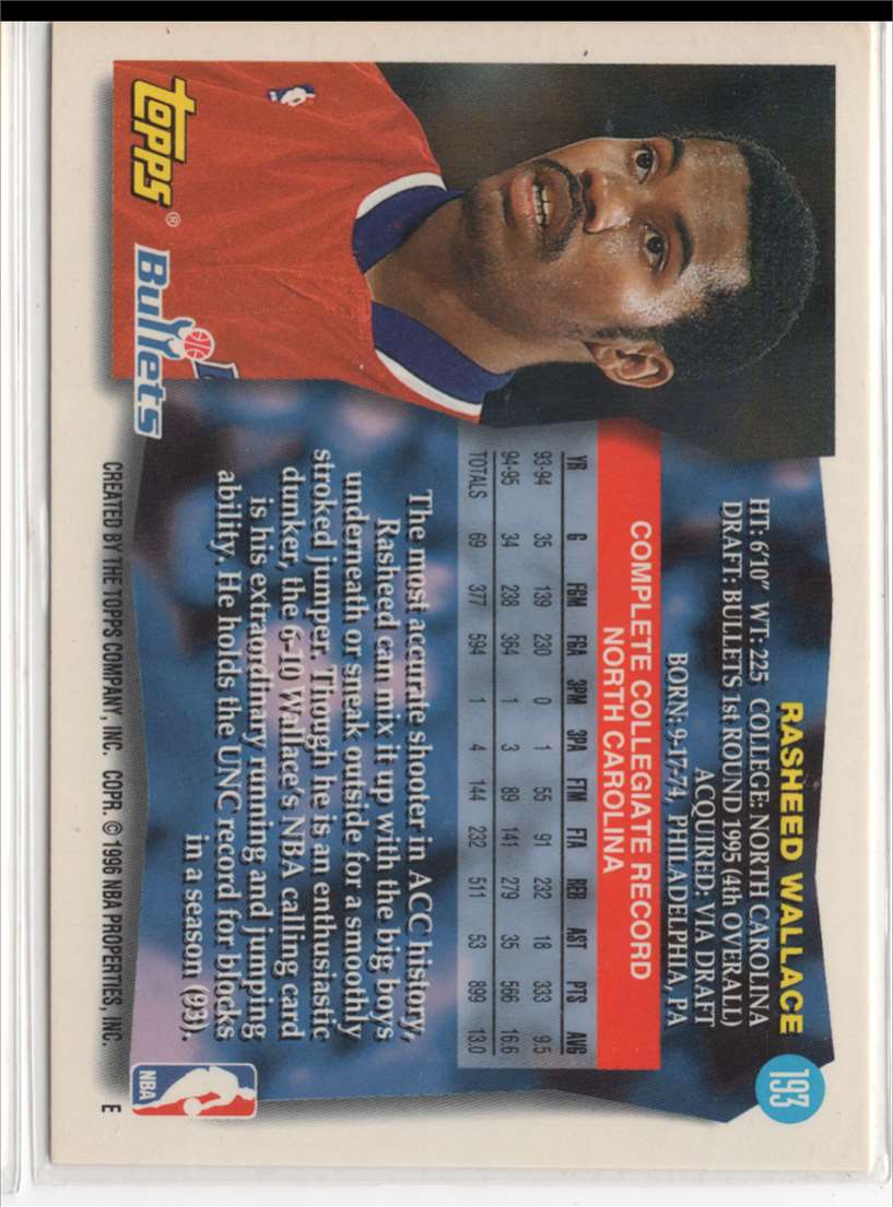 This 1996 Topps Rasheed Wallace #31 Washington Bullets card is a great addition to any collection. The card features a glossy image of Wallace in his Bullets jersey, looking ready to dominate on the court. The back of the card displays Wallace's stats for the season and a short bio about his basketball career. With this card, you can commemorate one of the NBA's most versatile and talented players in a classic way. Add this card to your collection today, and show your appreciation for the great Rasheed Wallace.