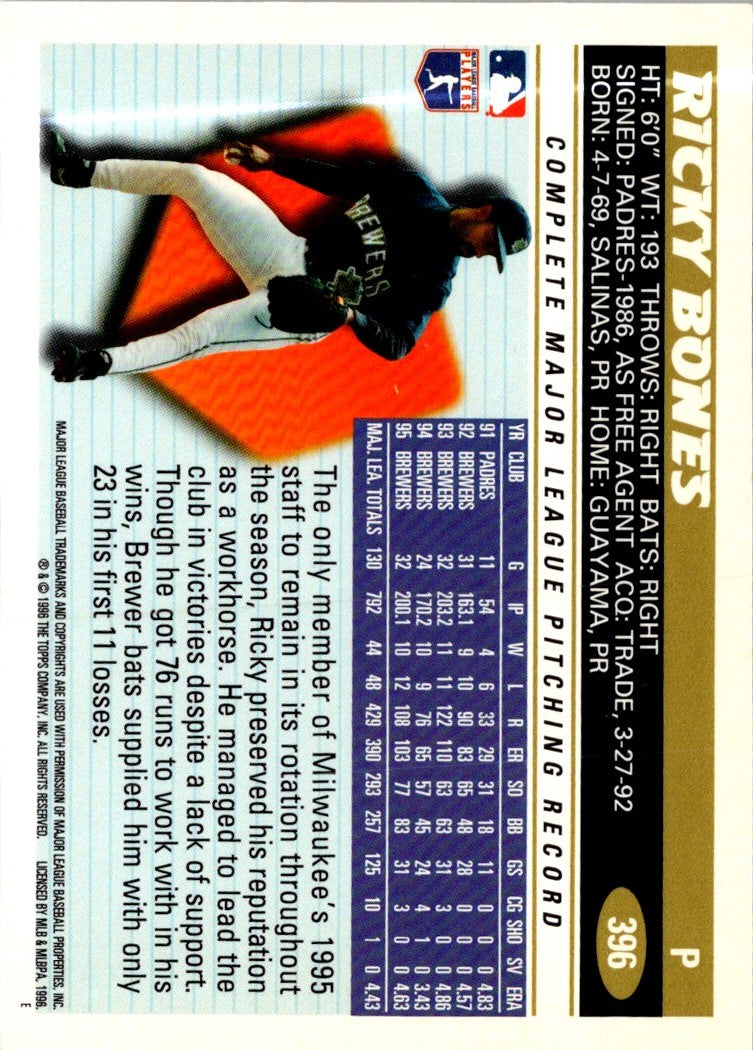 This 1996 Topps Ricky Bones #396 card from the Milwaukee Brewers is a must-have for any baseball card collector. Featuring Ricky Bones in his iconic baseball uniform, this card is sure to be the centerpiece of any collection. With its crisp, glossy finish, this card is sure to last for years to come. Add this classic card to your collection today!