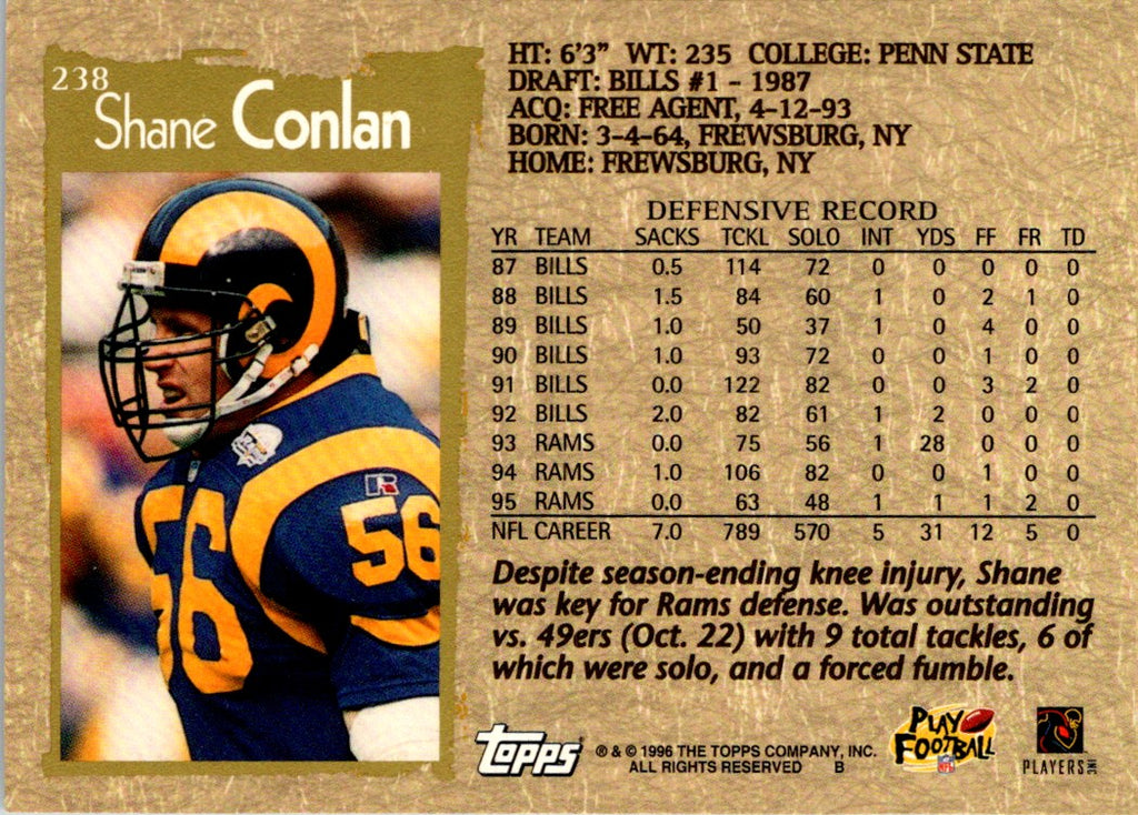 1996 Topps Shane Conlan #238 St. Louis Rams is a must-have for any NFL fan! This card features a stunning action shot of the former linebacker in his Rams uniform, with vibrant colors and an eye-catching design. With its impressive detail and high-quality construction, this card is sure to be a great addition to any collection. Whether you're a diehard Rams fan, a collector of NFL memorabilia, or just looking for a unique item to add to your collection, 1996 Topps Shane Conlan #238 St. Louis Rams is the perfect choice.