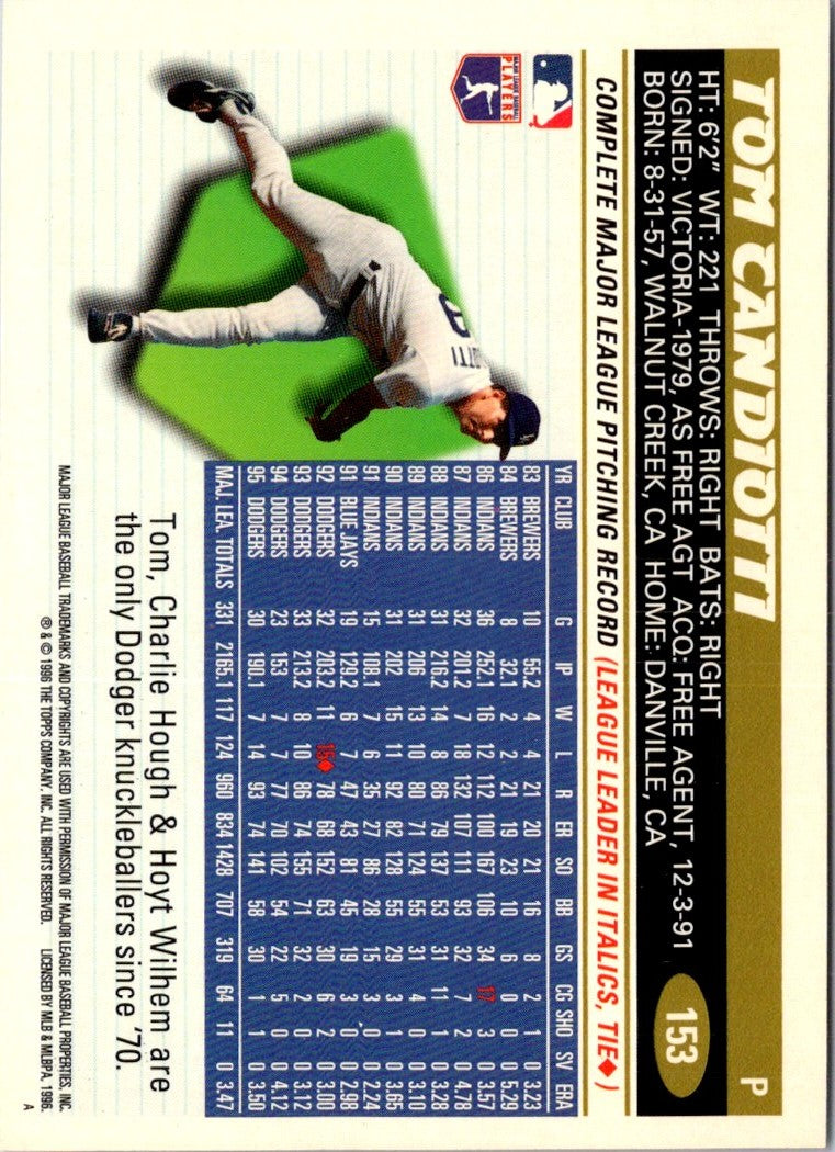 This 1996 Topps Tom Candiotti #153 card from the Los Angeles Dodgers is the perfect addition to any Dodgers fan's collection. It features Candiotti, a former pitcher for the Dodgers, in his blue and white pinstriped uniform with the Dodgers logo on the front and back. The card is in excellent condition and features Candiotti's career stats on the back. Add this card to your collection and celebrate the career of one of the Dodgers' all-time greats.