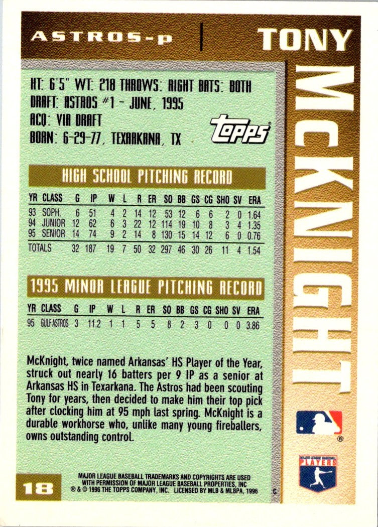 This 1996 Topps Tony McKnight #18 Houston Astros card is a great addition to any sports card collection. Featuring a sharp action shot of the All-Star pitcher, this card is sure to be a hit with Astros fans and card collectors alike. The card is printed on thick card stock and features bold colors and great detail. A must-have for all Tony McKnight and Astros fans, this card is a great way to show your support for the team and its star pitcher. Add this card to your collection today and show your Houston Astros pride!