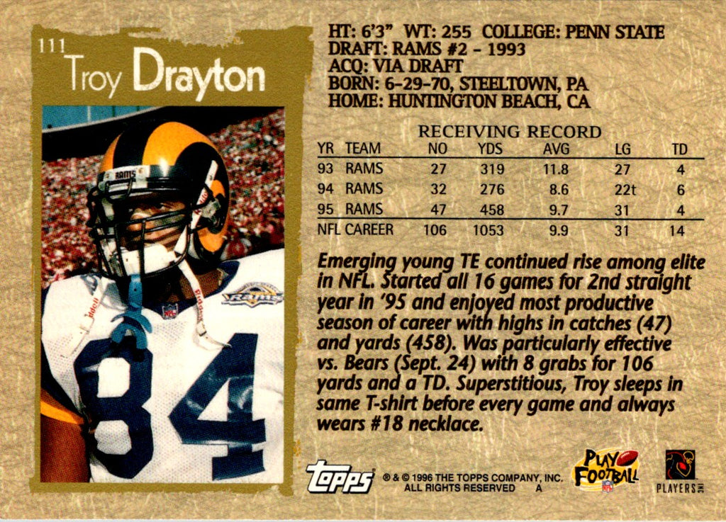 This 1996 Topps Troy Drayton #111 St. Louis Rams card is a must-have for any NFL fan. This card is a great way to commemorate Troy Drayton's tenure with the Rams. It features a full-color photo of Troy in action, along with his stats and team logo. It's perfect for any fan looking to add some Rams memorabilia to their collection. This card is sure to be a collector's item and will be a great addition to any football fan's collection.
