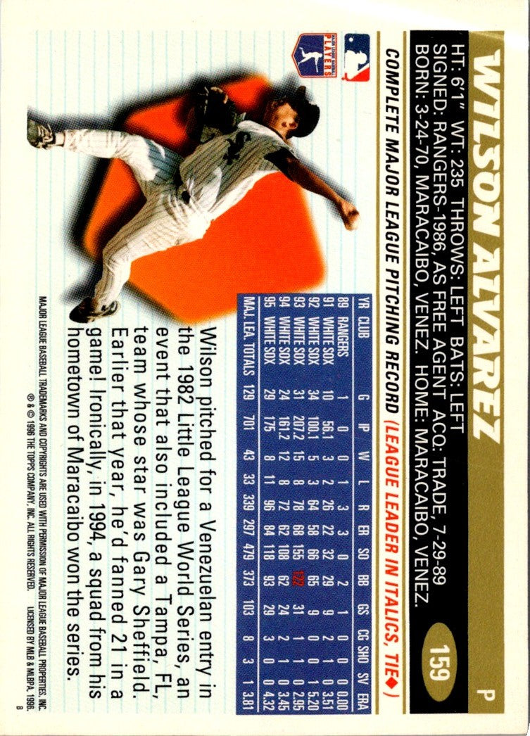 This 1996 Topps Wilson Alvarez #159 is a must-have card for any Chicago White Sox fan! With a full-color portrait of the pitcher in his White Sox uniform, this card is the perfect addition to any collection. It features detailed stats and records from his career, making it a great way to show your appreciation for the talented player. This card is a great way to commemorate the 1996 season and a must-have for your collection!