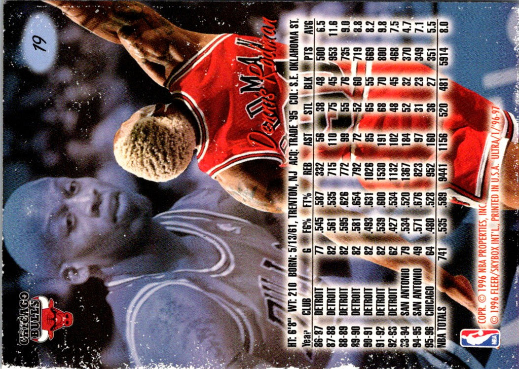 This 1996 Ultra Dennis Rodman #19Chicago Bulls card features a classic image of the famous NBA star. The card is in near-mint condition and is a great addition to any basketball fan's collection. The card features a detailed shot of Rodman in his Bulls uniform, showing off his skills on the court. It is a great reminder of Dennis Rodman's Hall of Fame career. This card is a must-have for any fan of the Chicago Bulls and the NBA. Add this amazing card to your collection today!