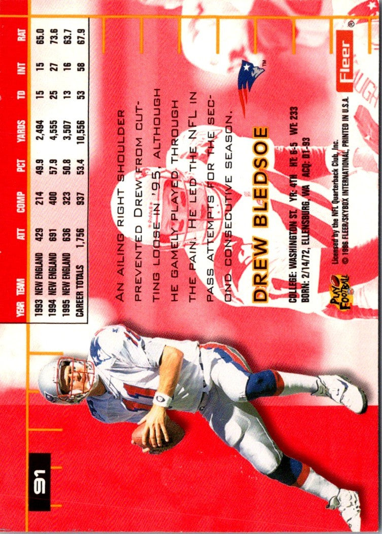 This 1996 Ultra Drew Bledsoe #91New England Patriots card is an essential part of any football fan's collection. A true piece of NFL history, this card celebrates one of the most successful quarterbacks of the 90s. The card features a vibrant full-color image of Drew Bledsoe in action, with the iconic Patriots logo and colors in the background. The card is printed on high-quality cardstock, making it a durable collectible. Add this classic card to your collection today and show your support for one of the best quarterbacks of all time.
