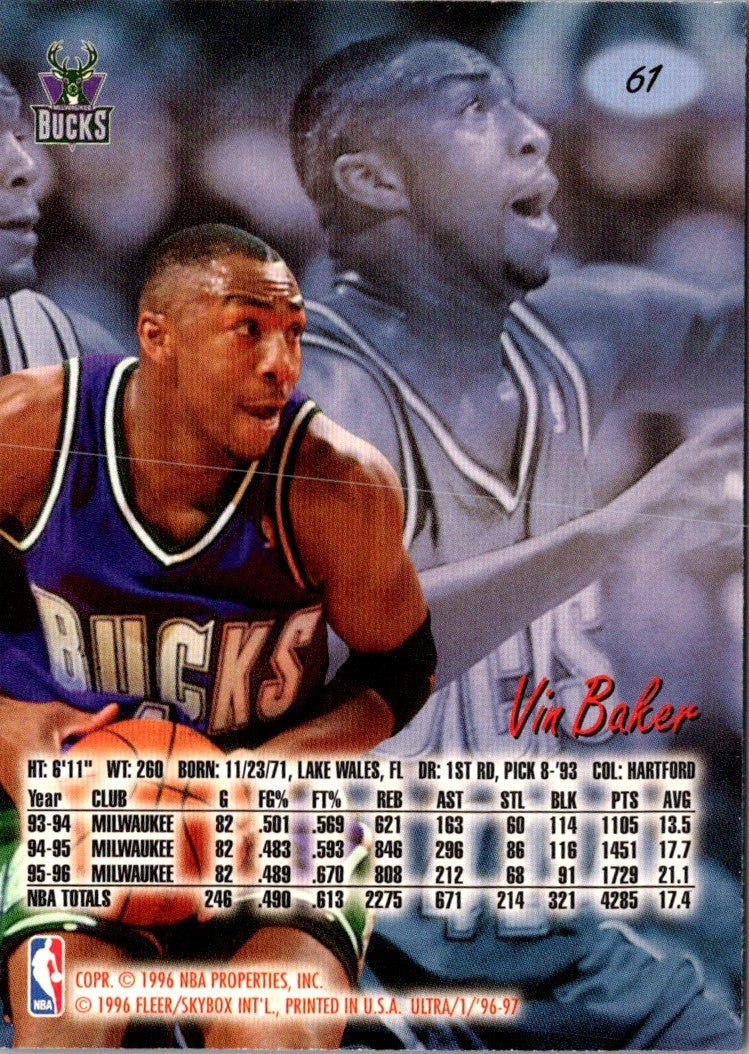 This 1996 Ultra Vin Baker #P-61 Milwaukee Bucks card is a must-have for every Bucks fan. Featuring a full-color action shot of the Hall of Famer, this card is sure to make an impressive addition to any fan's collection. With a glossy finish and bright colors, you can show off your Bucks pride and appreciation for one of the greatest players to ever wear the Bucks uniform. Don't miss out on adding this incredible card to your collection!