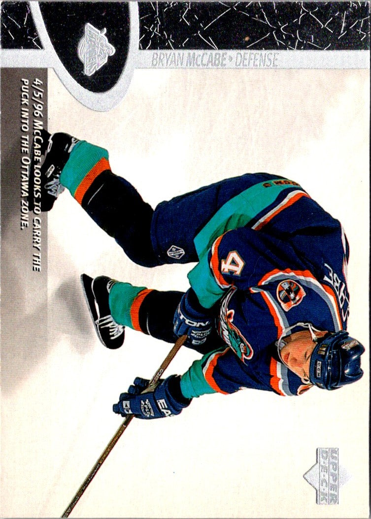 The 1996 Upper Deck Bryan McCabe #99 New York Islanders card is the perfect addition to any hockey fan's collection. Featuring the Islanders' star defenseman, this card features a crisp, clear image of McCabe in full color with the Islanders logo and his name in the background. It's a great way to show your Islanders pride while adding a bit of hockey history to your collection. The card is sure to be a conversation starter and highlight of any memorabilia collection. Add this one to your collection today and show your Islanders spirit!