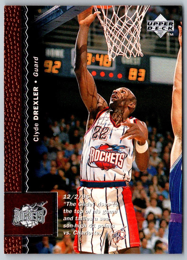 Introduce yourself to the legendary Clyde Drexler with this 1996 Upper Deck #44 card of the Hall of Fame guard! This card commemorates his time playing with the Houston Rockets and his accomplishments throughout his career. Featuring a stunning action photo of Drexler in his signature Nike gear and surrounded by a bold, vibrant design, this card is a must-have for any basketball fan! Add this classic to your collection today and experience the amazing legacy of Clyde Drexler!