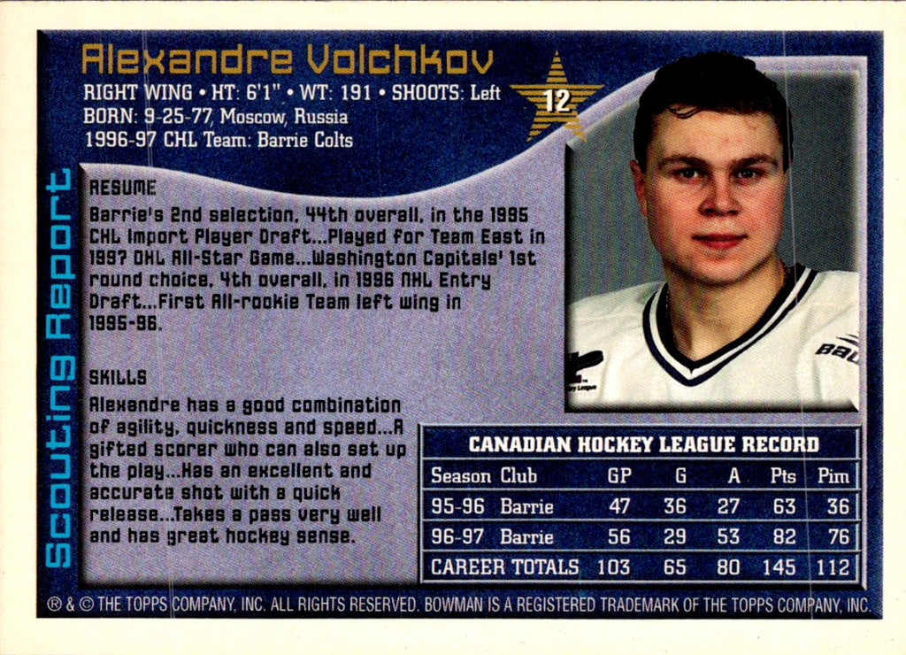 Alexander Volchkov was one of the most promising young hockey players in the 1997 CHL. His 1997 Bowman CHL card captures the pure athleticism and excitement he brought to the game. His action shot on the card shows him in his classic Barrie Colts uniform ready to make the play. The card is perfect for any collector looking to add a piece of hockey history to their collection.