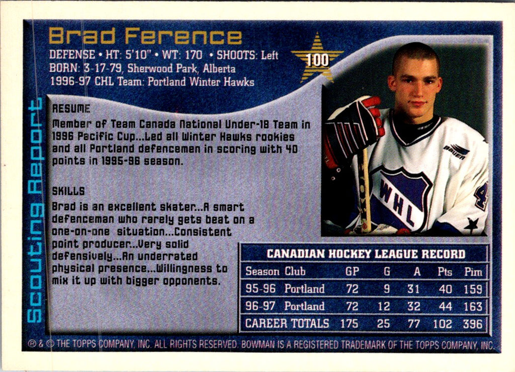 This 1997 Bowman CHL Brad Ference #100 Portland Winterhawks trading card is a must-have for any fan or collector! Featuring an action shot of Ference in his Winterhawks jersey on the front, and his vital stats and career highlights on the back, this card is a great way to remember one of the team's most iconic players. Add this card to your collection and show your support for the Winterhawks!
