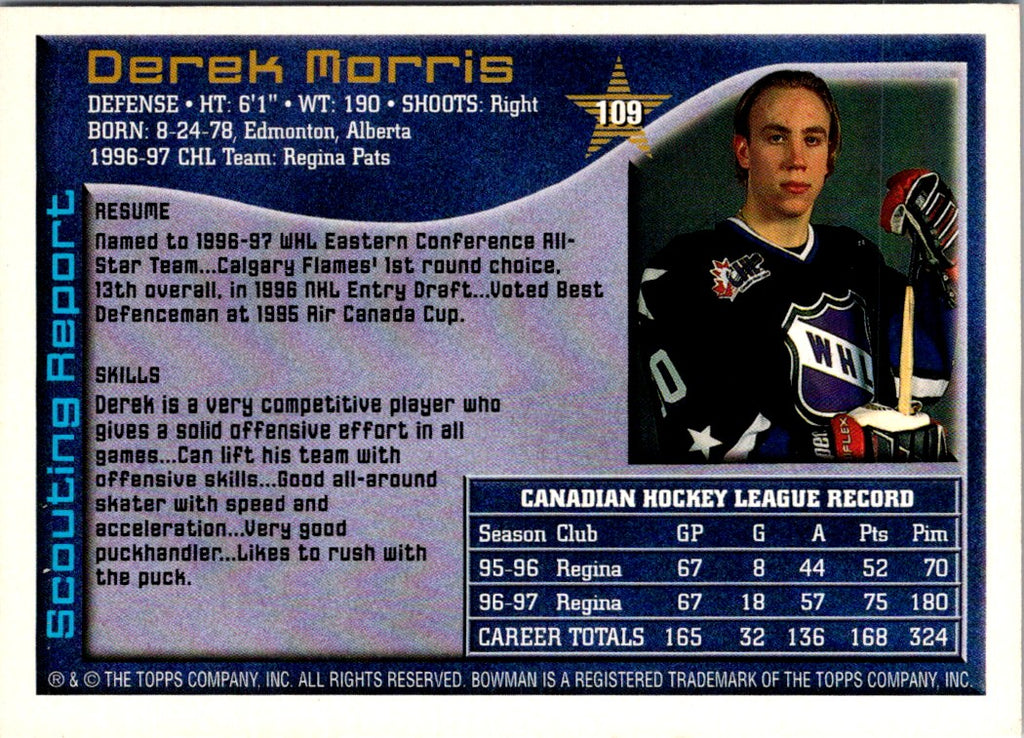 Introducing the 1997 Bowman CHL Derek Morris #109 Regina Pats card. This card is a must-have for any Derek Morris fan or hockey card collector. Derek Morris was a star defenseman in the CHL before going on to a successful NHL career. This card features a glossy finish with a vivid picture of Morris in his Regina Pats jersey. It is an essential addition to any hockey card collection!