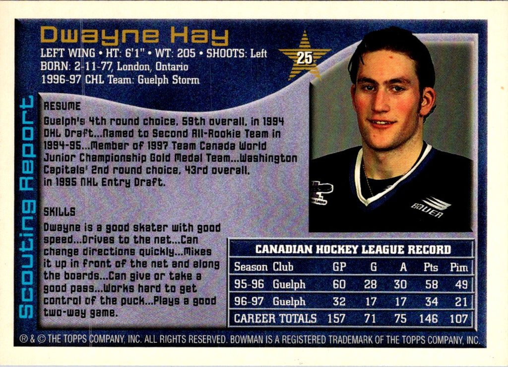 This 1997 Bowman CHL Dwayne Hay card (#25Guelph Storm) features an action shot of the renowned player in his Guelph Storm uniform. The card is in near mint condition and is a must-have for any hockey fan or collector. Dwayne Hay was a fan favorite during his time with the Guelph Storm and this card is a great way to commemorate his legacy. The card is perfect for any hockey collection or to give as a gift to a hockey fan. Add this card to your collection today and show your support for Dwayne Hay and the Guelph Storm!