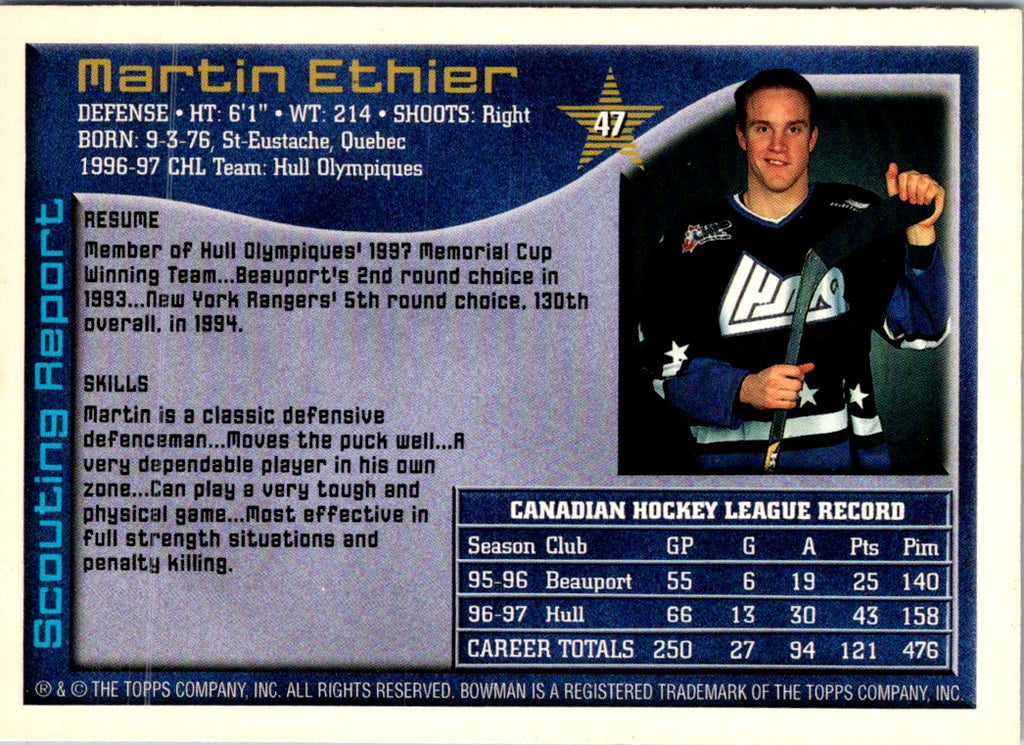 This 1997 Bowman CHL Martin Ethier #47Hull Olympique card is a must-have for any hockey card collector. Featuring Ethier in his Hull Olympiques uniform, this card is sure to be a great addition to any collection. It is in excellent condition, with minimal signs of wear. Ethier was a major part of the Hull Olympiques team, playing in the CHL for four seasons. This is a fantastic way to remember his time with the team and to honor his career. Add this unique piece of hockey memorabilia to your collection today!
