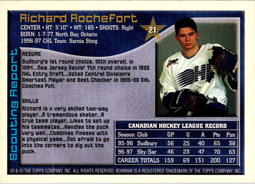 This 1997 Bowman CHL Richard Rochefort #21 Sarnia Sting card is a must-have for any fan of the Sarnia Sting or hockey collector. Featuring the classic Bowman design, this card features a fantastic photo of Rochefort in action, capturing him in mid-stride as he takes the ice. The reverse side of the card has detailed biographical information about Rochefort and his career. This card is a great way to commemorate a special player and a great addition to any hockey card collection.
