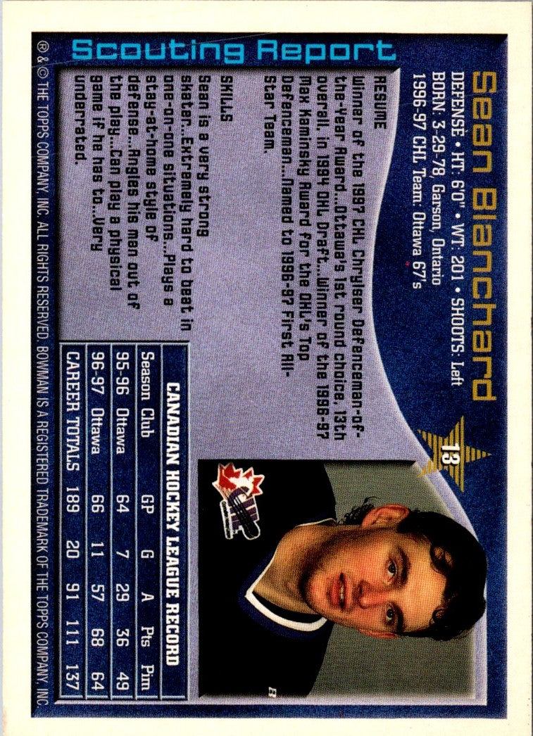 This 1997 Bowman CHL Sean Blanchard #13 Ottawa 67's card is a must-have for any hockey fan! This card features a spectacular full-color image of Sean Blanchard in his Ottawa 67's uniform. The back of the card is printed with a full career stat history to date. The card is in excellent condition, with no creases. Add this card to your collection and show your pride for the Ottawa 67's!