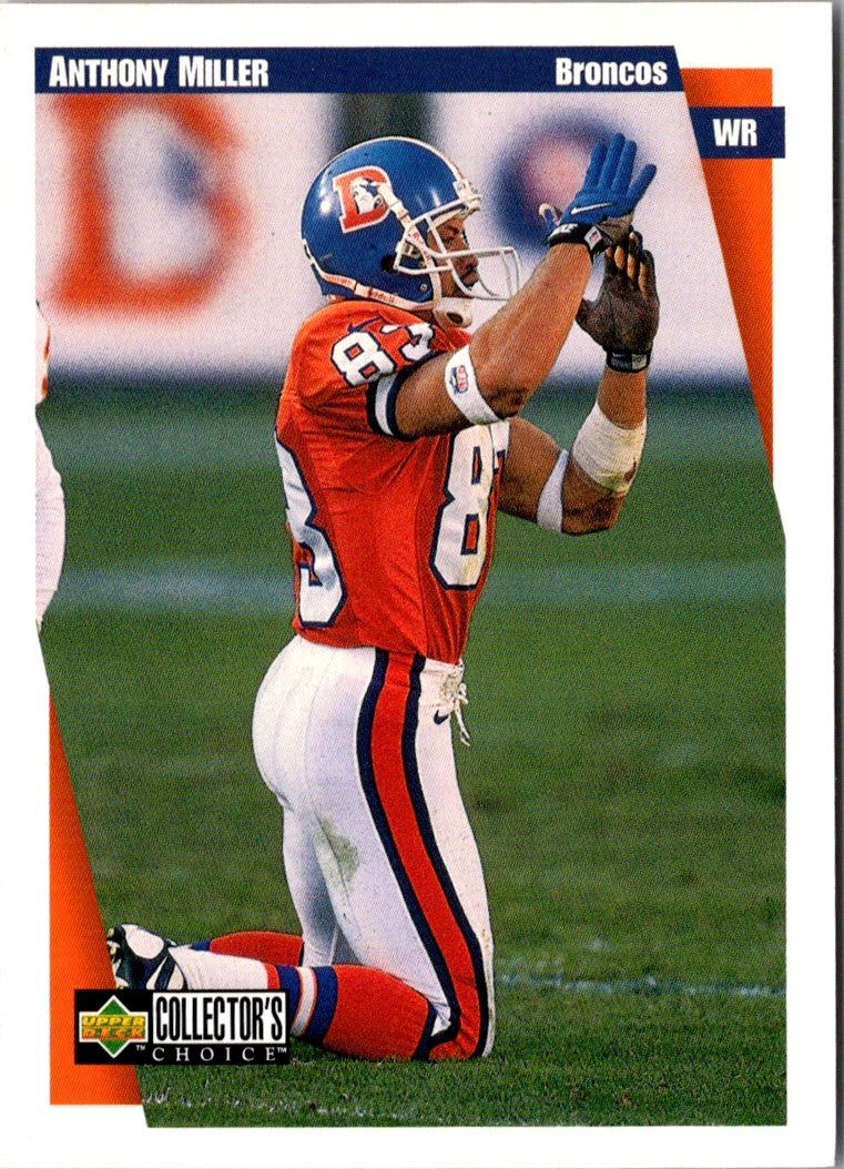 This 1997 Collector's Choice Anthony Miller #117 Denver Broncos card is a must-have for any collector. Miller was an integral part of the Broncos offense and was a key player in their success in the late 1990s. He was a Pro Bowl selection in 1997 and a three time All-Pro selection. This card is a great way to commemorate Miller's career and his contributions to the Broncos. The card features an action shot of Miller in his Broncos uniform and is printed on quality card stock. Add this card to your collection today and celebrate the career of one of the greats.