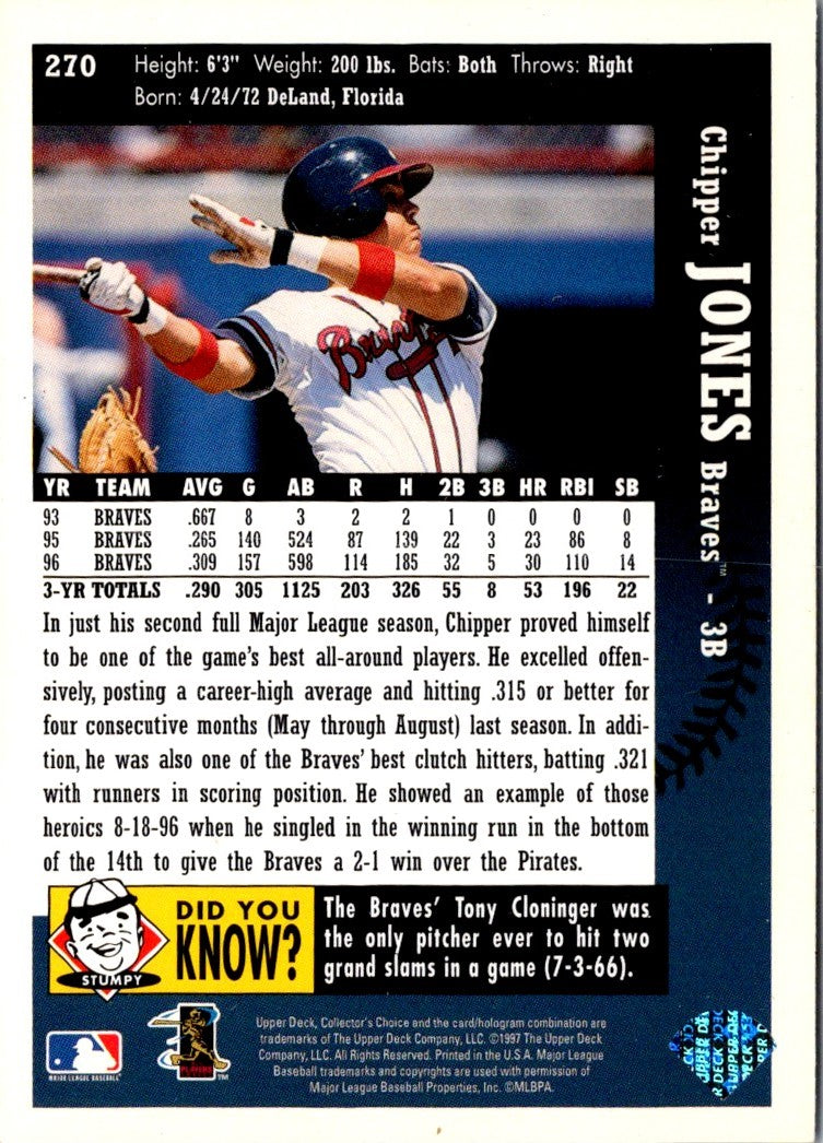 This 1997 Collector's Choice Chipper Jones #270 Atlanta Braves card is a must-have for any Braves fan! This card features a classic shot of Chipper in his Braves uniform, with a bright red border and a white background. The card is in near-mint condition, with only minor wear and tear. It's a great way to show your support for one of baseball's all-time greats! And, of course, it's a great addition to any baseball card collection. Don't miss out - add this card to your collection today!