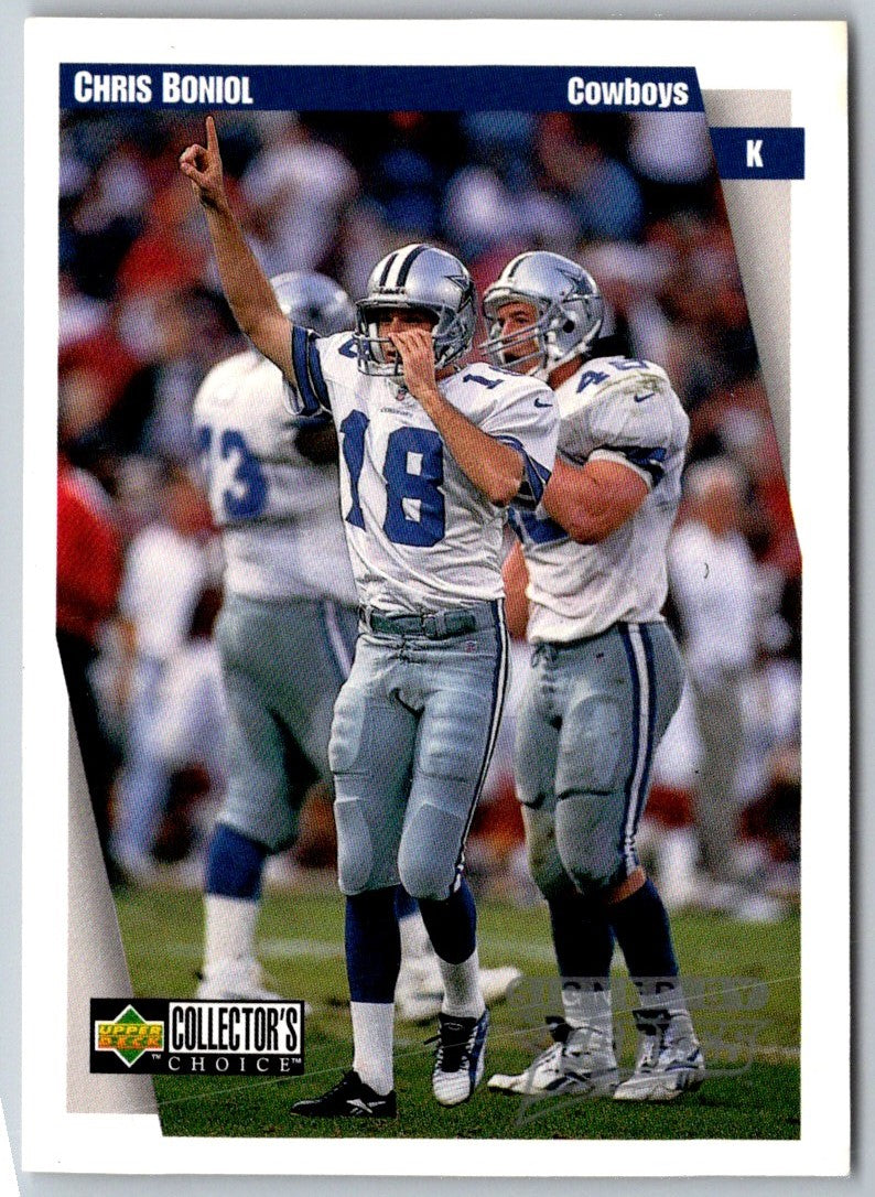 This 1997 Collector's Choice Chris Boniol #163 Dallas Cowboys card is a valuable piece for any Cowboys fan! Featuring a full-color action photo of Boniol, this card captures the Cowboys' former placekicker in his prime. It is a great addition to any football fan's collection, and is sure to be the centerpiece of any Cowboys fan's collection. With its vibrant colors and bold design, this card is sure to stand out in your collection. Get this card before it's gone!