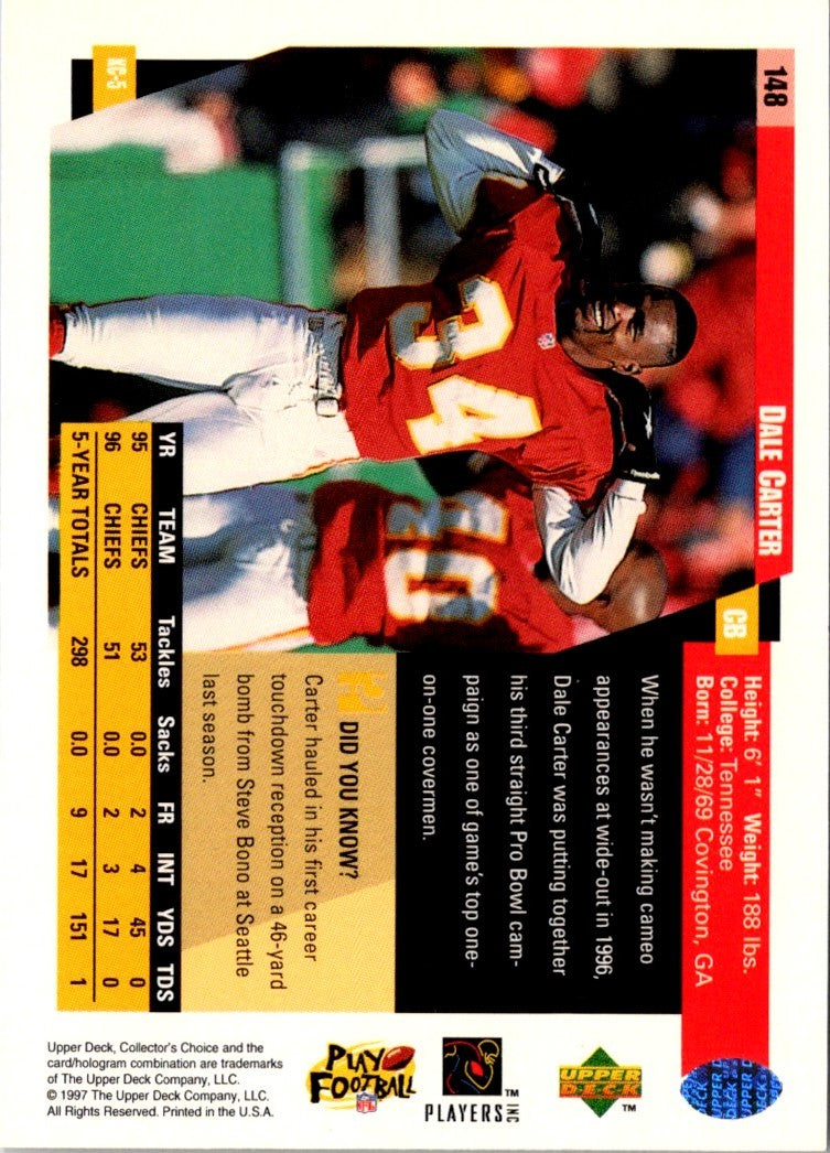 This 1997 Collector's Choice Dale Carter #148 card is an essential piece of memorabilia for any Kansas City Chiefs fan! Featuring a crisp image of the Hall of Fame cornerback, this card is a perfect addition to any collection. Carter was an electrifying player who had a knack for making big plays. He had a seven-year career with the Chiefs, where he was a two-time Pro Bowler and was ranked the team's #2 all-time cornerback. This card is sure to be a great conversation piece and a reminder of one of the Chiefs' greatest players. Add it to your collection today!