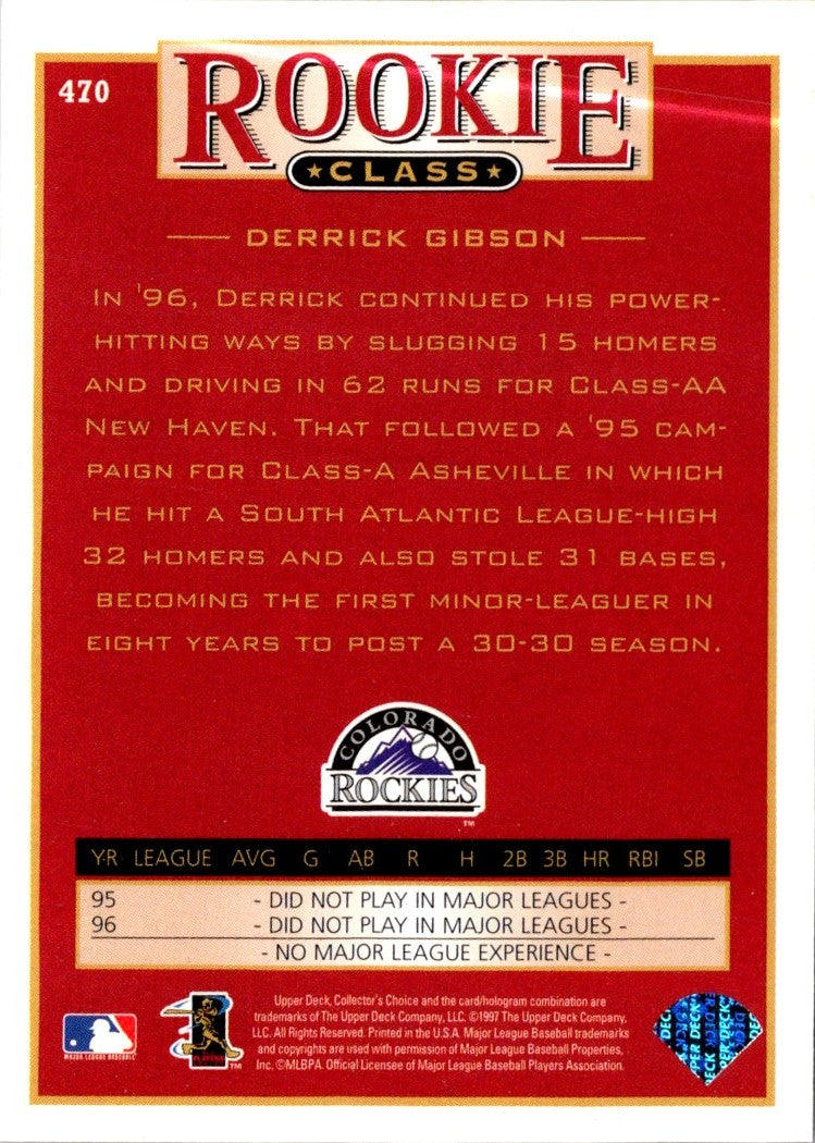 This 1997 Collector's Choice Derrick Gibson #470 Colorado Rockies card is an essential piece for any fan's collection. Featuring a bold design and vibrant colors, the card showcases Gibson in full swing as a member of the Rockies. With his stats listed on the back, the card is a great way to celebrate the career of the three-time All-Star outfielder. Add this special card to your collection today and show your support for one of the greatest players to ever don a Rockies uniform.