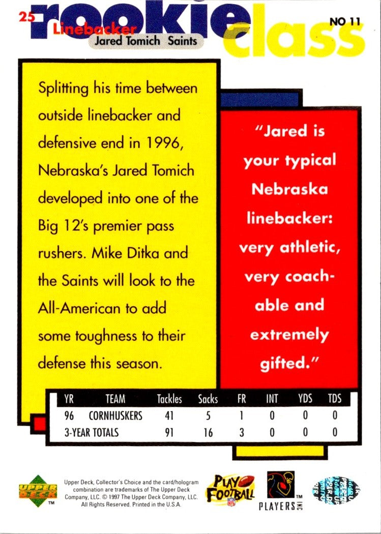 This 1997 Collector's Choice Jared Tomich #25New Orleans Saints card is a must-have for any Saints fan. Featuring a full-color glossy photograph of Tomich, this card captures the excitement of the 1997 season. It is printed with crisp, vibrant colors, and its edges are in great condition. The back of the card includes detailed information about Tomich's career and statistics. Add this card to your collection today and show your Saints pride.