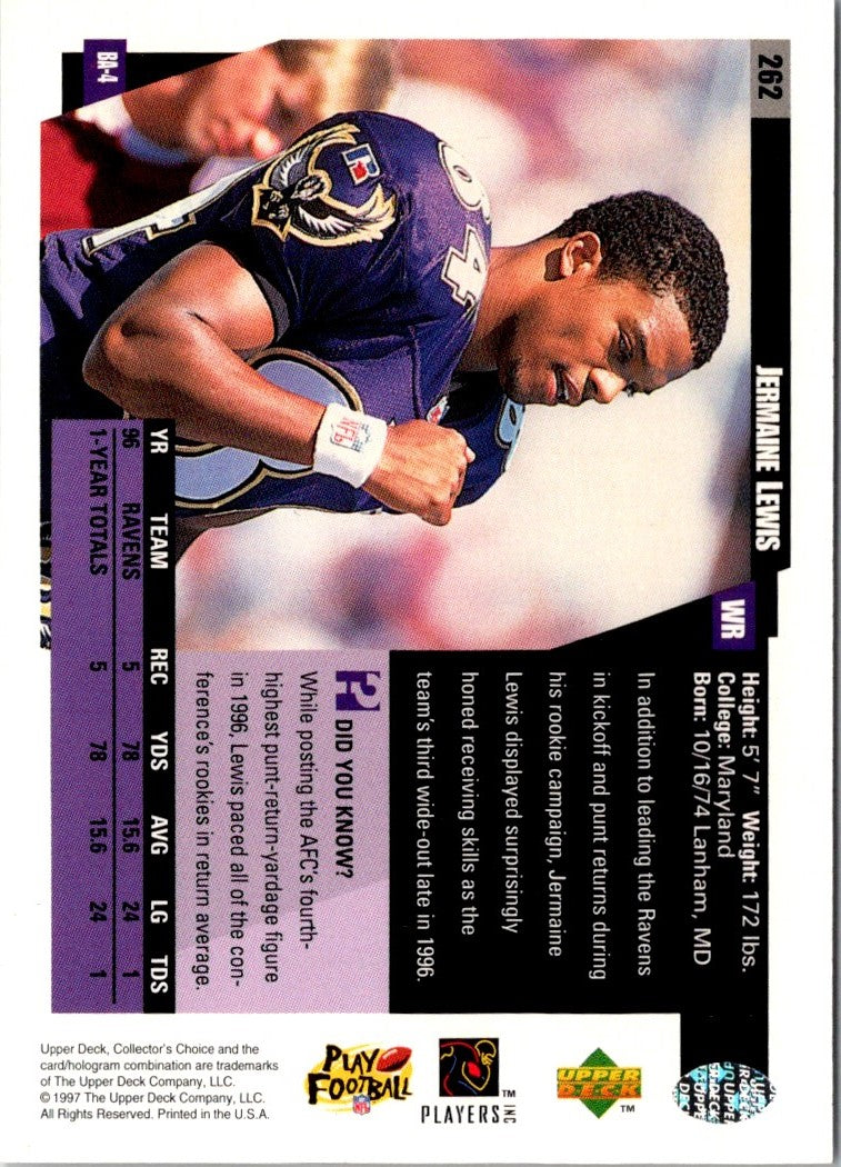 This 1997 Collector's Choice Jermaine Lewis #262 Baltimore Ravens card is the perfect addition to any sports fan's collection. Featuring an action shot of the talented wide receiver, the card will make a great gift for any Ravens fan. With bold and vibrant colors, the card will stand out from the rest of your collection. Lewis, a three-time Pro Bowler, was an integral part of the Ravens squad during the 1997 season. Get your hands on this card and start your collection today!