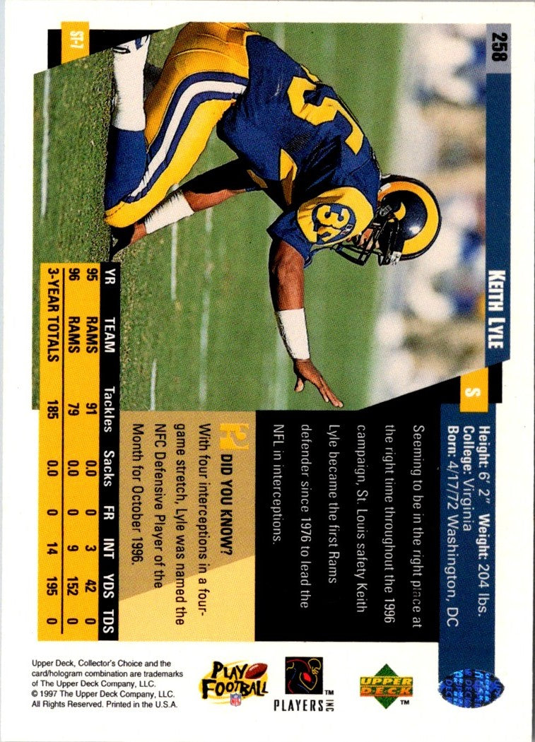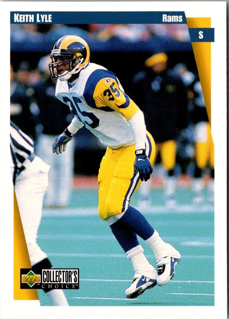 This 1997 Collector's Choice Keith Lyle #258 St. Louis Rams card is a must-have for any football fan! Featuring a full-color photo of the St. Louis Rams' safety, this card is in near-mint condition and is sure to be a prized addition to any collection. With a detailed biography and career statistics printed on the back, this card is a great way to commemorate the career of one of the NFL's best. Add this 1997 Collector's Choice Keith Lyle #258 St. Louis Rams card to your collection today!