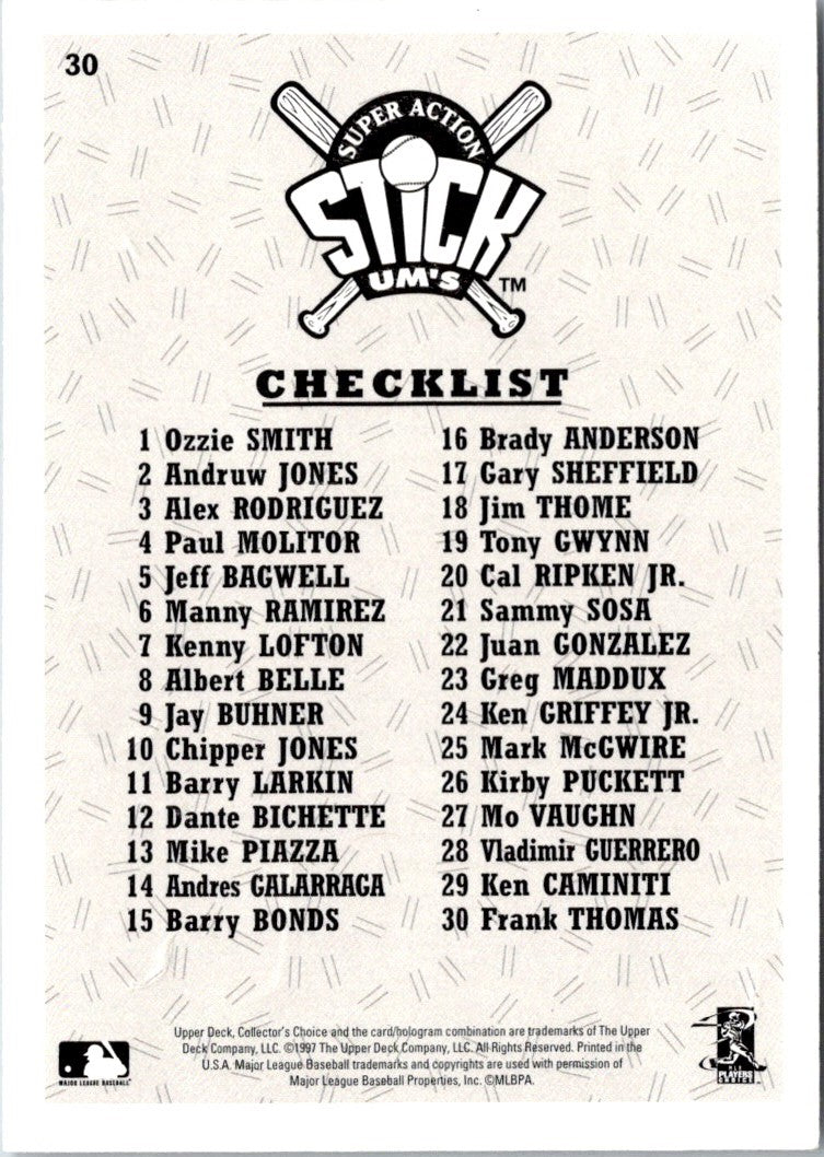 This 1997 Collector's Choice Stick'Ums Retail Frank Thomas #NNO Chicago White Sox is perfect for any White Sox fan. Featuring iconic graphics of the legendary slugger, this figure is a must-have for any collector. Durable construction ensures that this figure will last for years to come. Put your fandom on full display with this one-of-a-kind collectible.