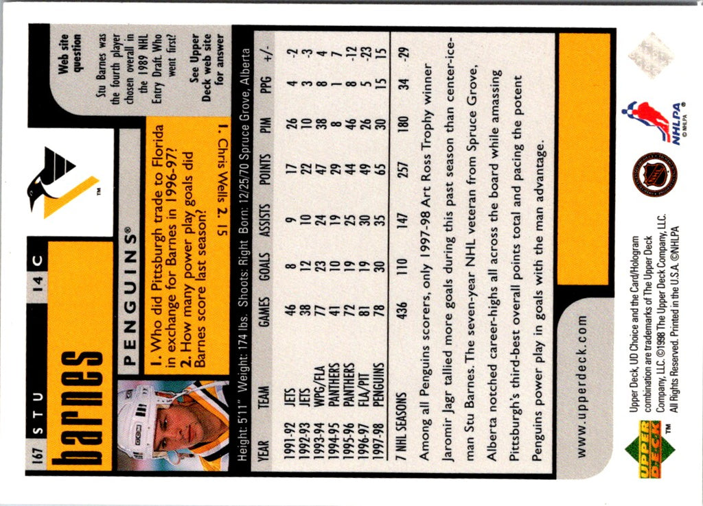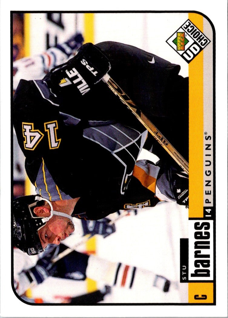 This 1997 Collector's Choice Stu Barnes #212 hockey card is a must-have item for Pittsburgh Penguins fans! Featuring a full-color action shot of Barnes in his Penguins uniform, this card is sure to be a great addition to any hockey card collection. This card is in excellent condition, and the vibrant colors will make it stand out in any display. Add this card to your collection today and celebrate the legacy of Stu Barnes!