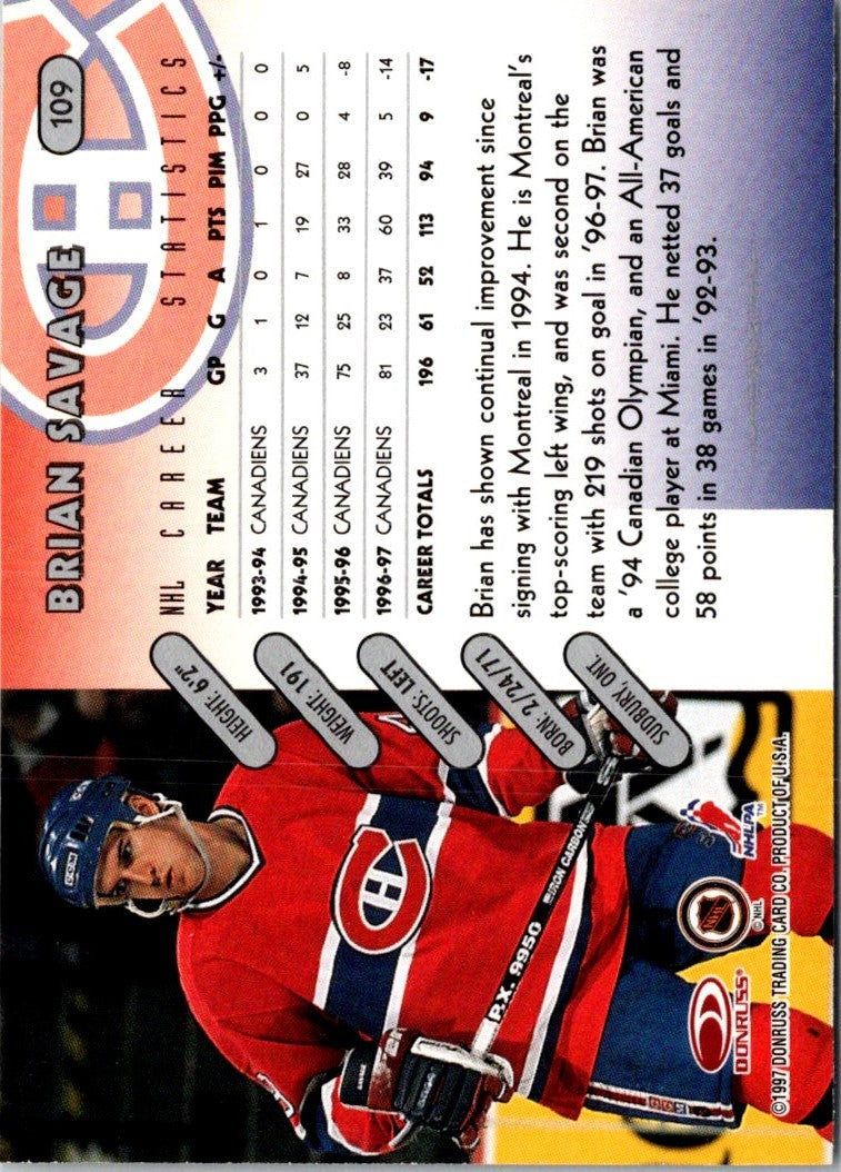 This 1997 Donruss Brian Savage #109 card from the Montreal Canadiens is a must-have for any hockey fan! Savage was a reliable forward in the NHL for many years and this card celebrates his time as a member of the Canadiens. Featuring a full-color action photo of Savage in his classic Canadiens uniform, this is an essential card for any hockey collection. Donruss cards are known for their quality and craftsmanship, and this Savage card is no different. Grab this card today and add it to your collection!
