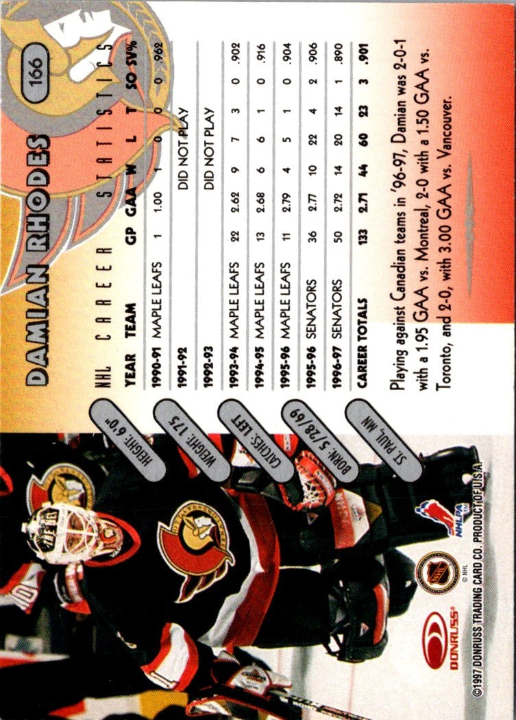 This 1997 Donruss Damian Rhodes #166 card captures an iconic moment in hockey history - the Ottawa Senators' goalie in full action! The card features a glossy finish and vibrant colors that bring the image to life. It's a must-have for any hockey collector or fan. With a unique design and bold details, this card allows you to show off your team spirit and add an important piece to your collection. Own a piece of sports and hockey history and add this 1997 Donruss Damian Rhodes #166 card to your collection today!