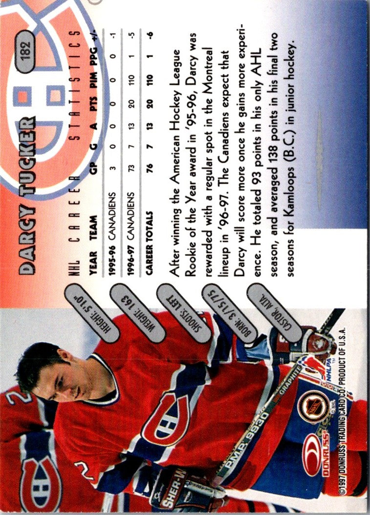 This 1997 Donruss Darcy Tucker #182 card is the perfect addition to any Montreal Canadiens fan's collection! Featuring vibrant colors and a detailed design, this card makes a great collectible and is sure to bring a smile to any hockey fan's face. Add this card to your collection and show your support for the beloved Montreal Canadiens!